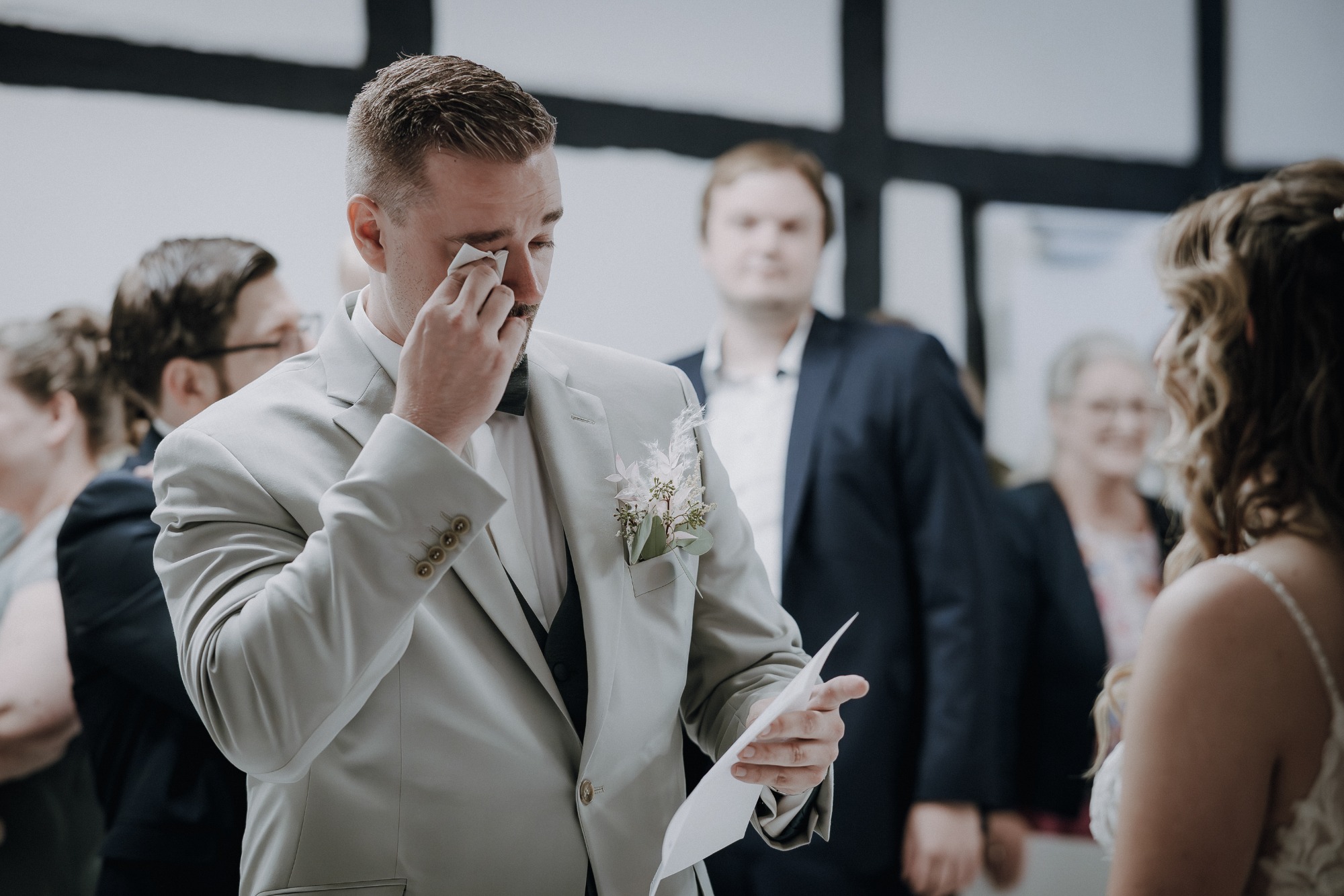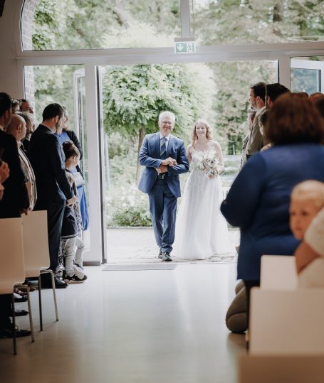 Als die Braut, begleitet von ihrem Vater, das Standesamt in Hof Middendorf in Bergkamen betrat, lag pure Emotion in der Luft. Der erste Blick des Bräutigams, Tränen bei den Gästen und das innige Ja-Wort – all das durfte ich fotografisch und in kurzen Videosequenzen dokumentieren. Für mich sind diese Augenblicke das Herzstück einer Hochzeitsreportage.